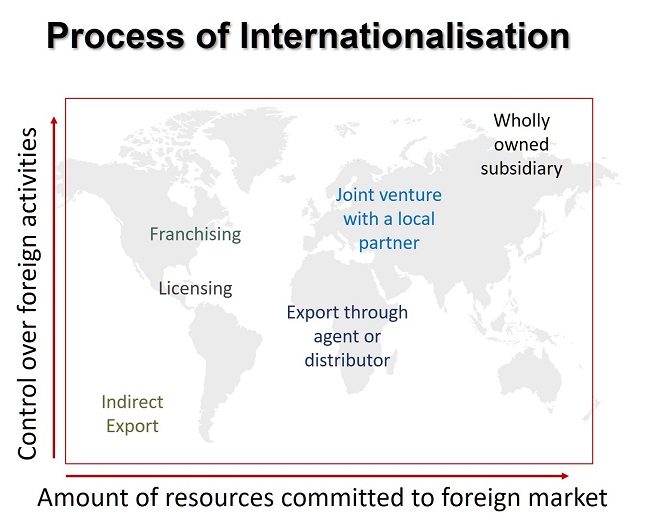 "Internationalization is the process of "increasing involvement in international operations" (Welch and Luostarinen 1988), where the firm transfers products, services and resources across countries, and is thus required to select which countries to operate in and the mode of operation.'