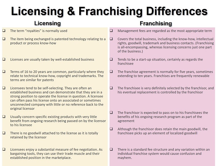 - Although some business people think that it is a specialized form of licensing in which the franchisee is allowed to use intangible property (trademark, brand name), the fact that the franchisee is required to agree on abiding by strict rules as to how it does business makes a lot of difference.