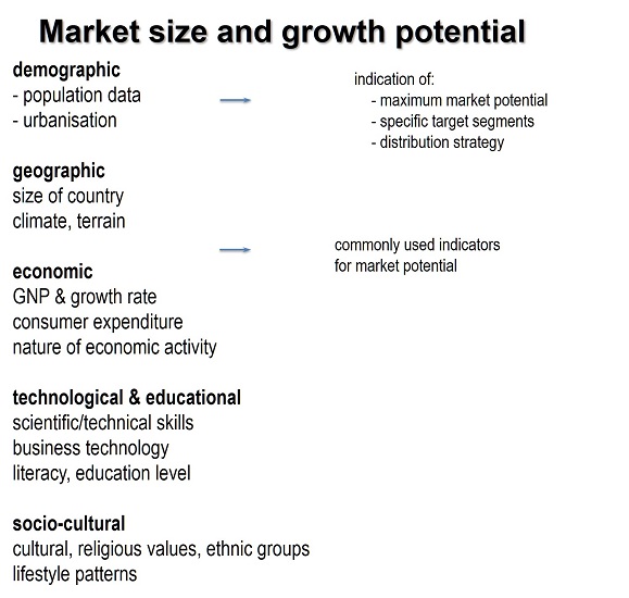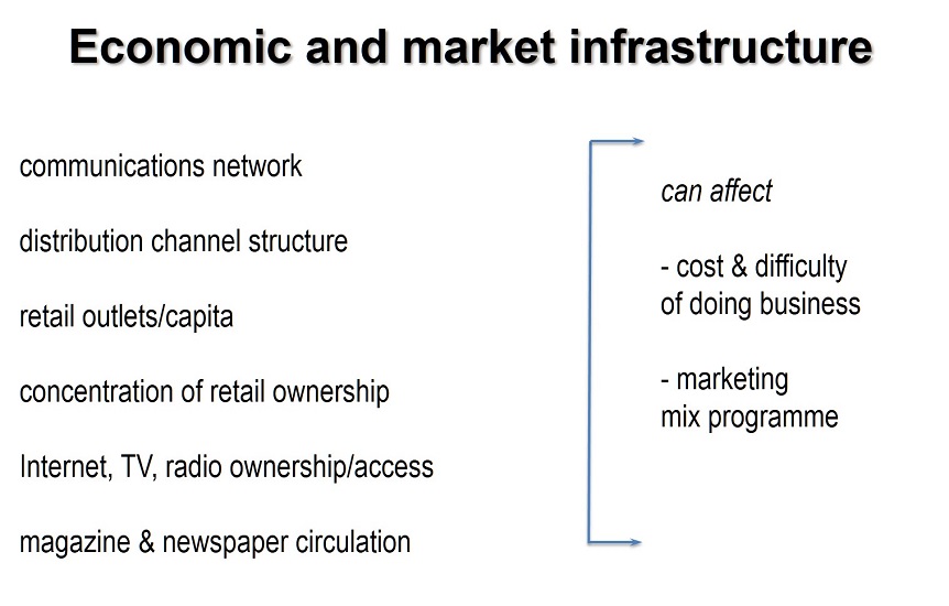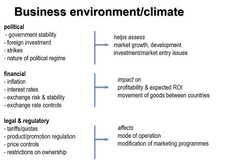 - Government regulations; non-tariff barriers; customer characteristics, expectations & preferences; purchase patterns; economic development; climate & infrastructure