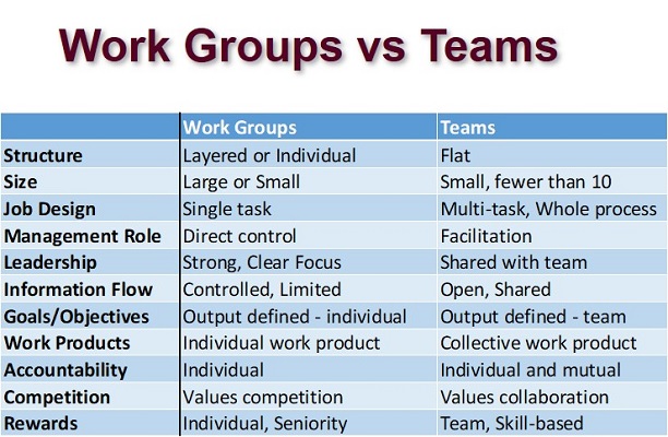 Douglas K Smith & Jon R Katzenbach conclude that all too often the choice between work group or team is not made deliberately and with reflection. It is important to ask whether it really is potential for a team or whether it is better to create / maintain an effective work group, which probably performs better than a non-functioning team.