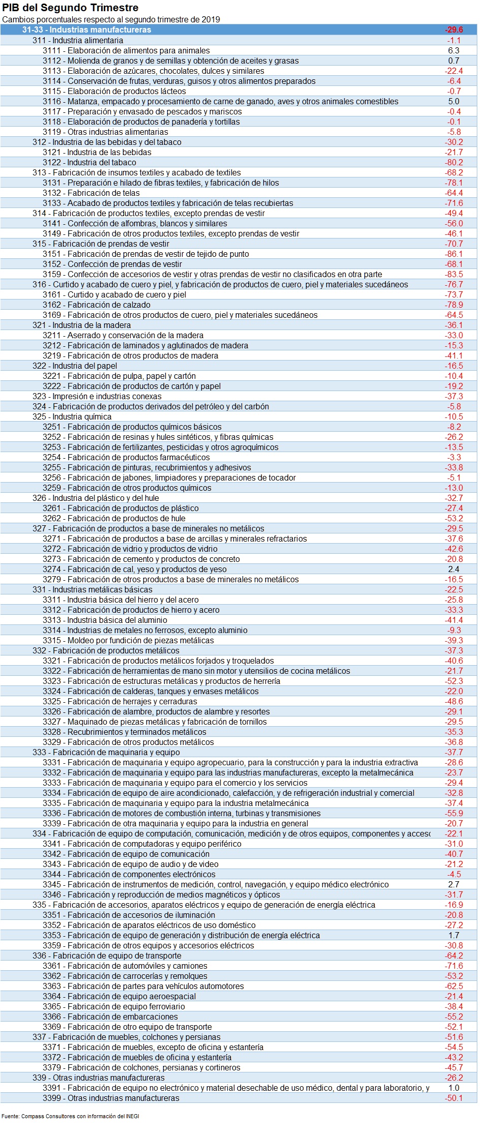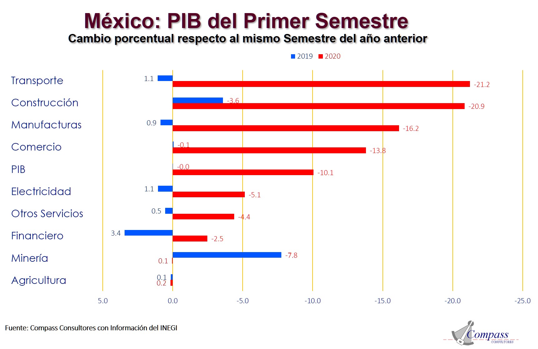 De los grandes sectores, el que sufrió la mayor caída fue el de Transportes con 39.3%, seguido por la Construcción 34.2% y las manufacturas 29.6%.