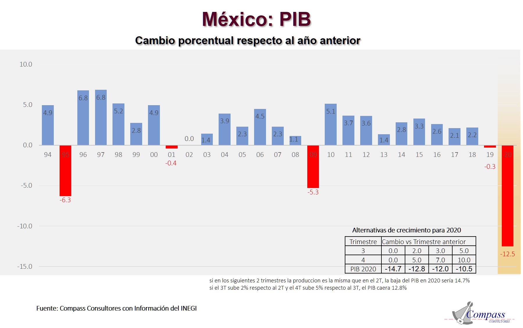 En otro escenario, si el tercer trimestre sube 2% respecto al segundo y el cuarto sube 5% respecto al tercer trimestre, el PIB caerá 12.8%.