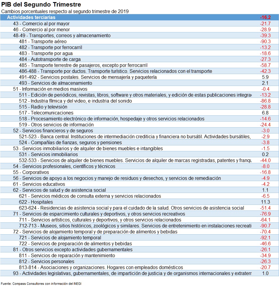 Los sectores con menores caídas fueron el Primario (Agricultura, Ganadería, Pesca y Forestal) 0.5%, Financieros 3.0% y la minería 4.8%.